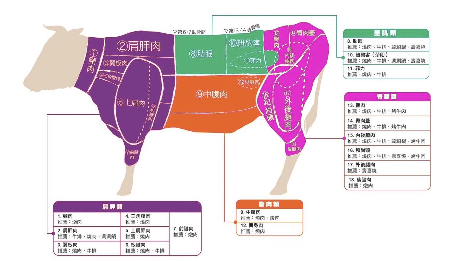 部位分類:牛肉依照不同部位有不同的口感與烹調方式,例如肋眼(Ribeye)油花多、適合煎烤;牛腱結實,適合燉煮;菲力(Tenderloin)肉質細嫩,適合快煎或炙燒。