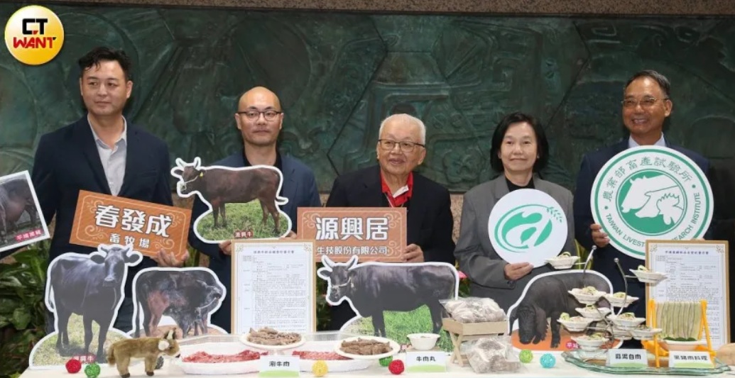 首例由民間保育成功並命名的「源興牛」、「平埔黑豬」,8日舉行記者會,李登輝基金會董事長劉泰英(左三),春發成畜牧場場長李榮春(左一)均到場接受祝賀。(圖/黃鵬杰攝)